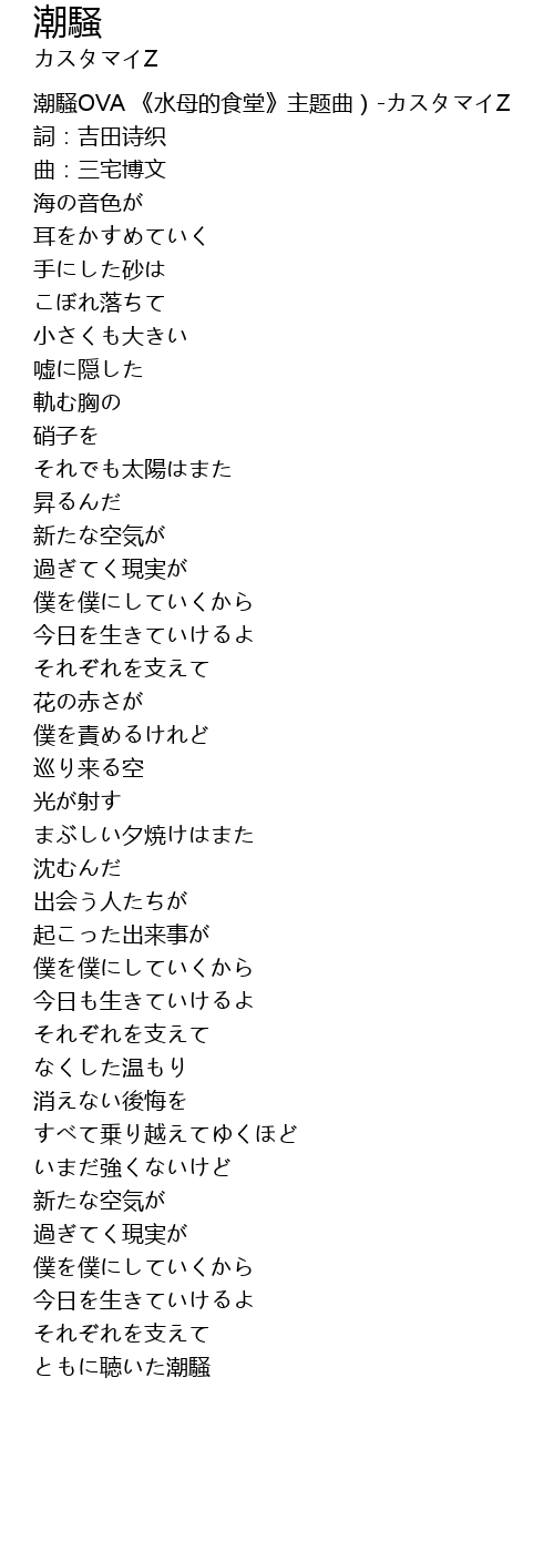 | [00:00.300] | 潮騒OVA 《水母的食堂》主题曲)-カスタマイZ |