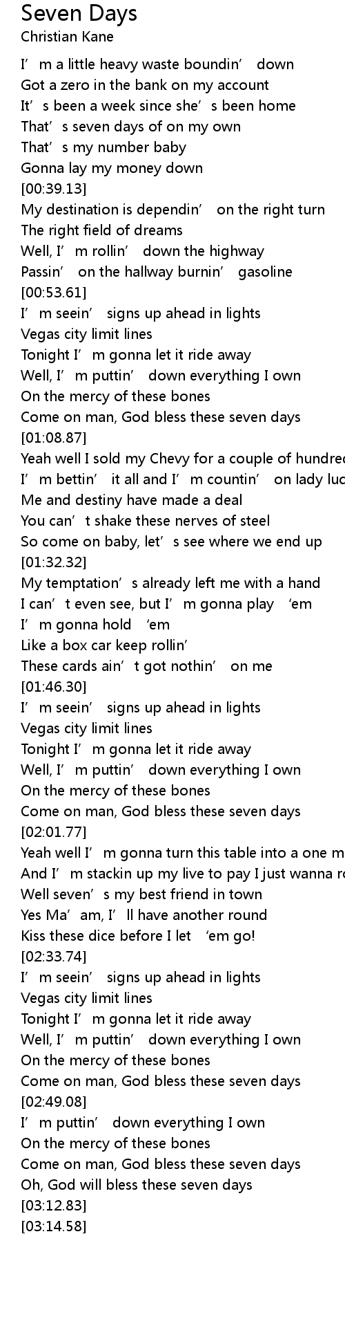 | [02:54.38] | Come on man, God bless these seven days |