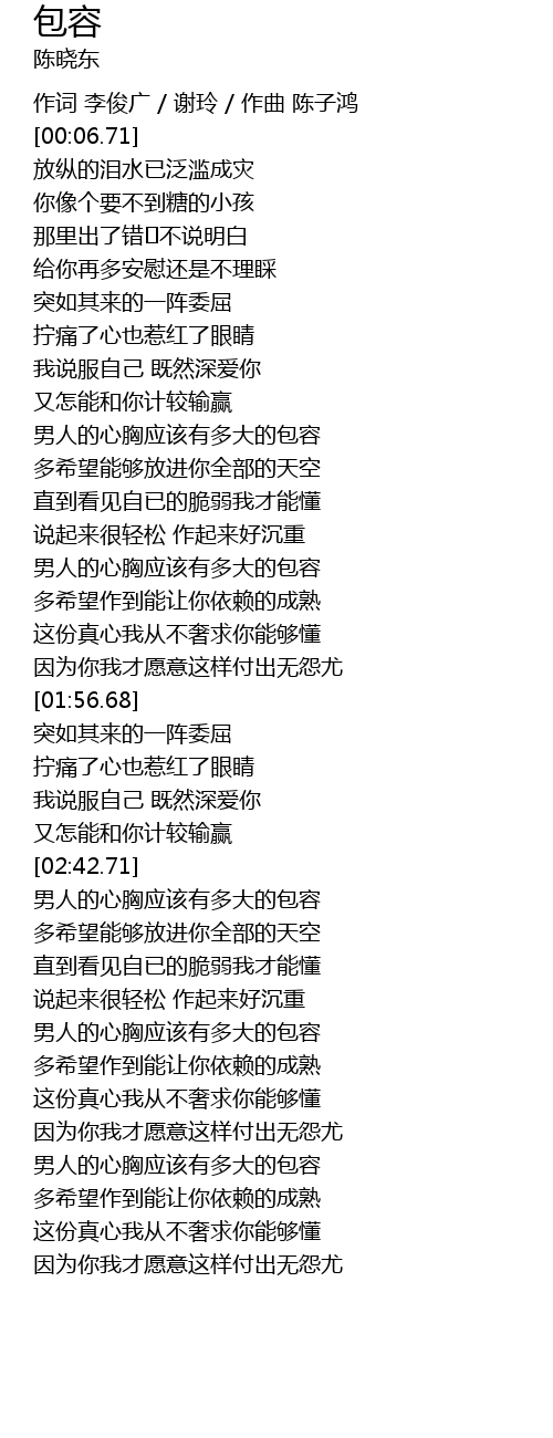 | [03:34.97] | nan ren de xin xiong ying gai you duo da de bao rong |