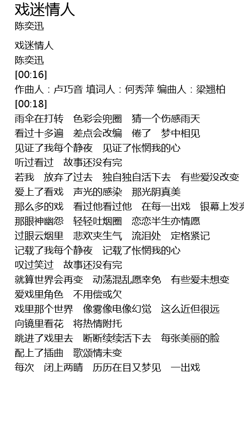| [00:17] | 作曲人:卢巧音 填词人:何秀萍 编曲人:梁翘柏 |