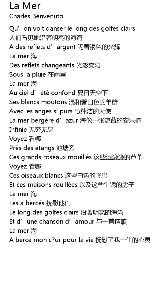 | Qu' on voit danser le long des golfes clairs rén men kàn jiàn tā yán zhe míng liàng de hǎi wān | |