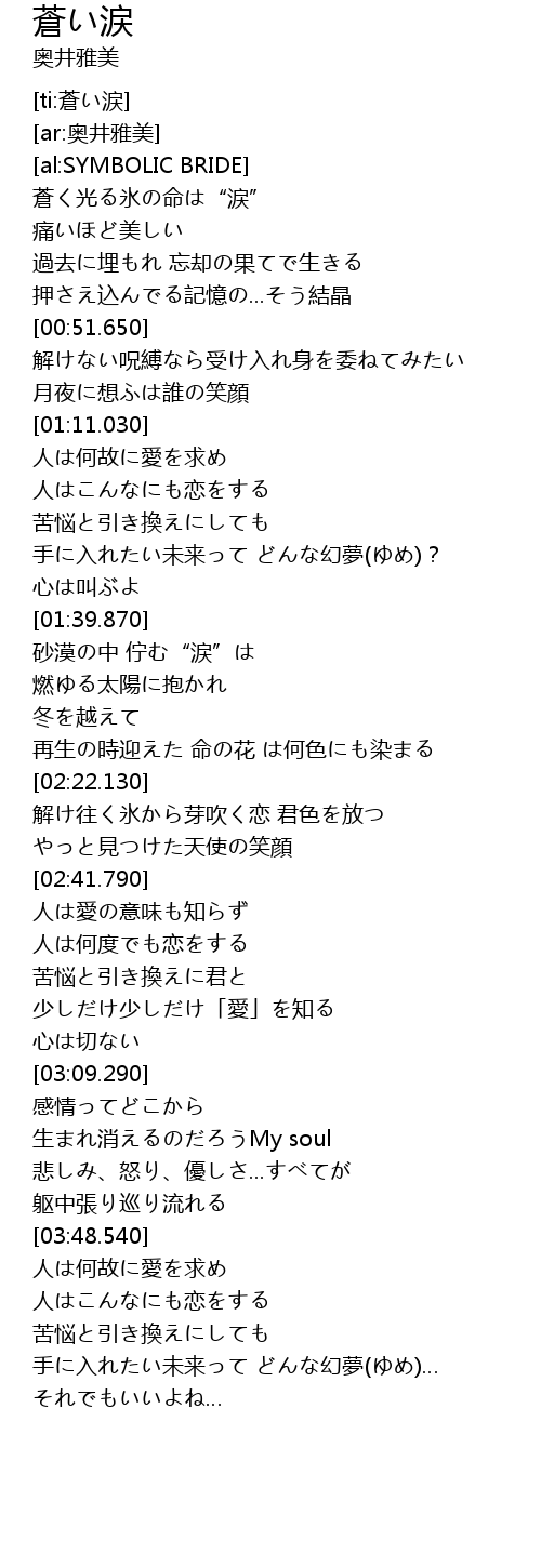 | [00:19.010] | 蒼く光る氷の命は“涙” |