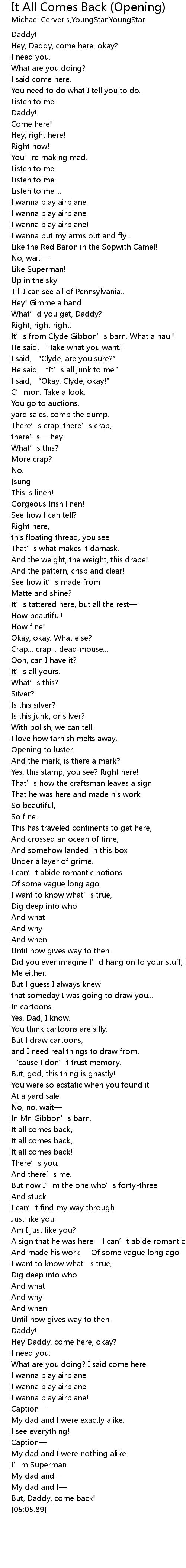 | [03:18.60] | Did you ever imagine I’d hang on to your stuff, Dad? |