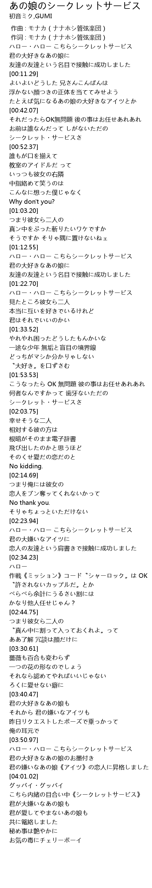 | [04:02.00] | こちら内緒の目合い中《シークレットサービス》 |