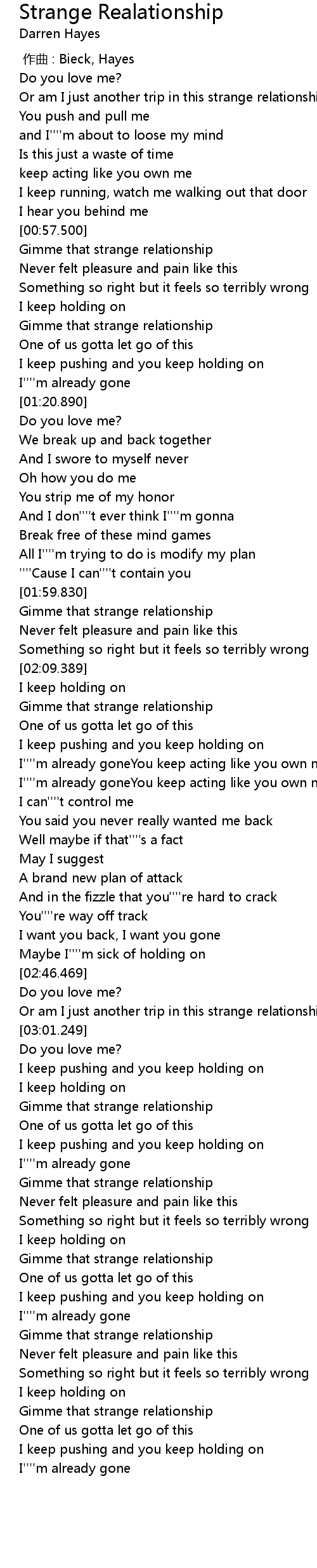 | [00:58.160] | Gimme that strange relationship |