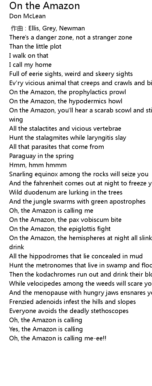 | [00:58.68] | On the Amazon, the hypodermics howl |