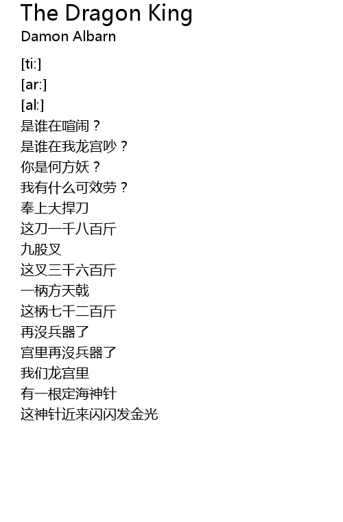 | [00:10.75] | shì shuí zài wǒ lóng gōng chǎo? |