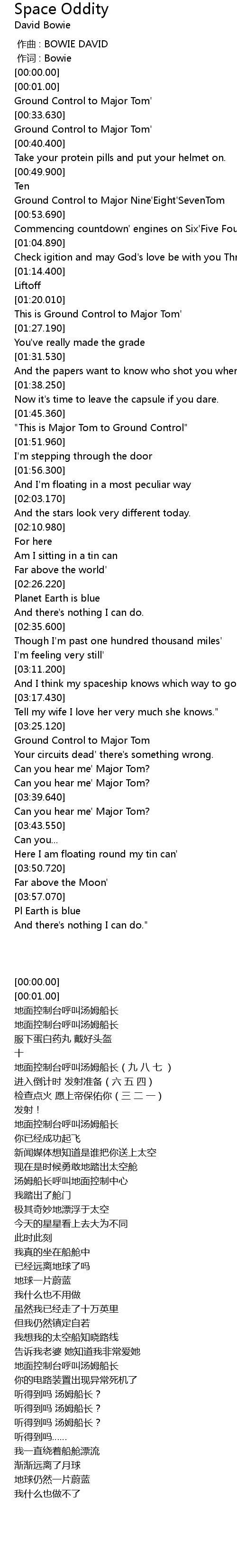 | [01:47.940] | " This is Major Tom to Ground Control" |