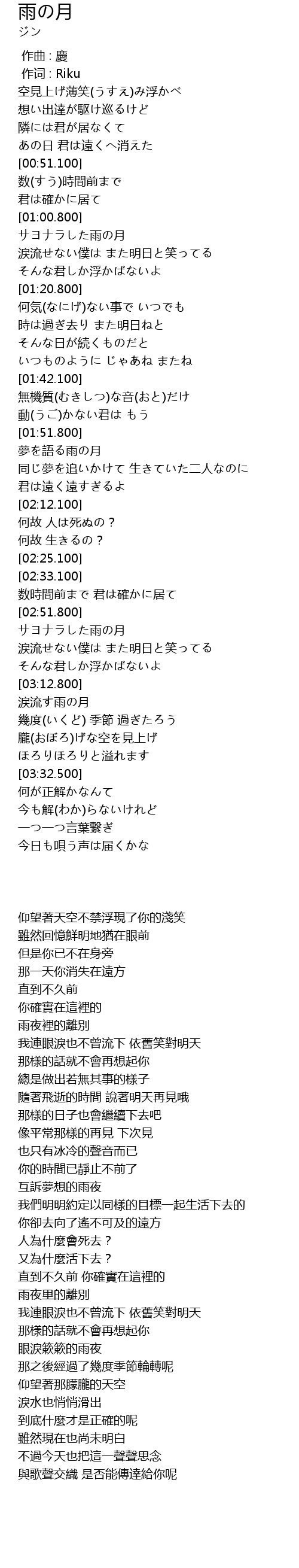 | [03:13.100] | 涙流す雨の月 |