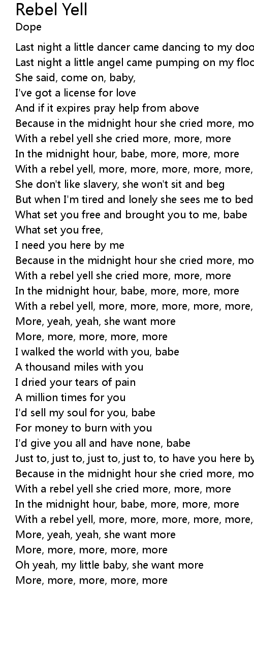 Because in the midnight hour she cried more, more, more |