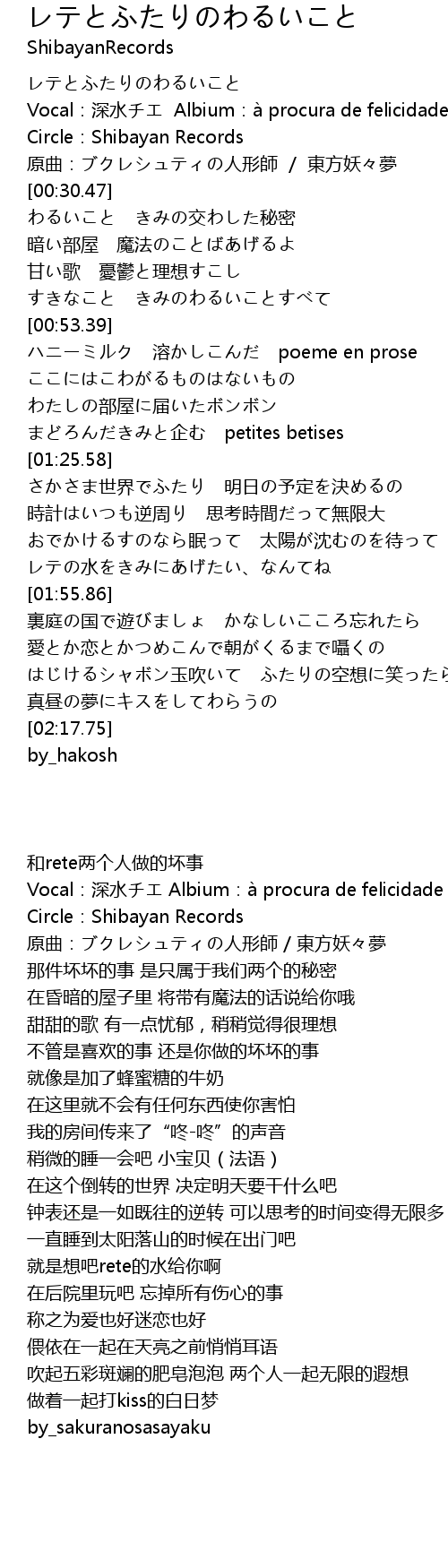 | [00:26.46] | 原曲:ブクレシュティの人形師 / 東方妖々夢 |