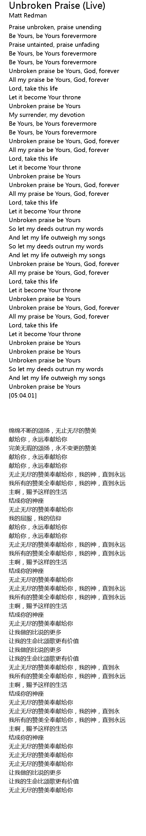Unbroken praise be Yours, God, forever |