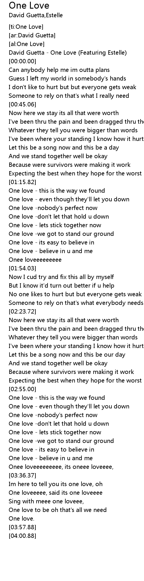 | [03:41.63] | One loveeeee, said its one loveeee |