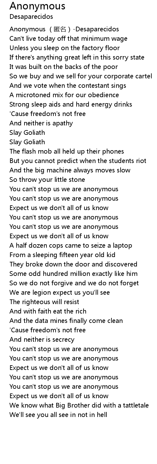 | [02:56.13] | You can't stop us we are anonymous |