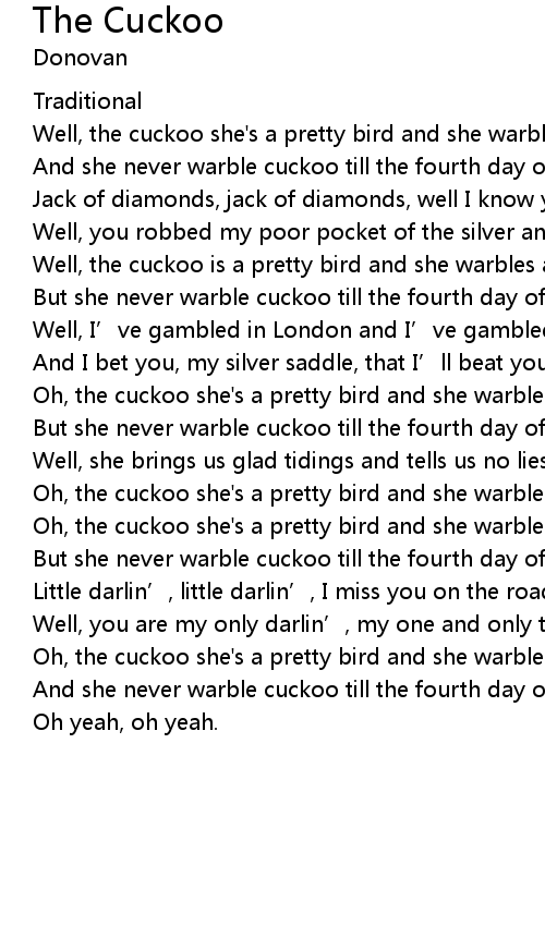 | Well, the cuckoo she' s a pretty bird and she warble as she fly | |