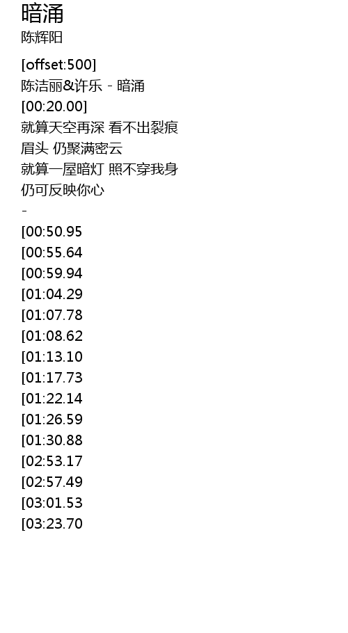 | [00:05.00] | 陈洁丽&许乐 - 暗涌 |