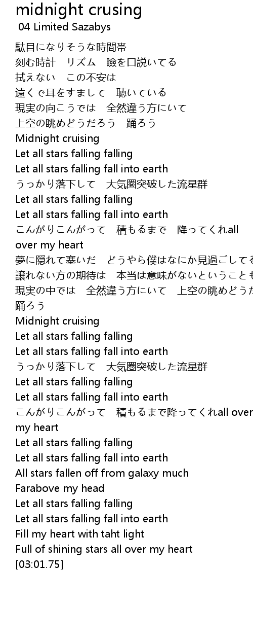 | [00:47.58] | うっかり落下して 大気圏突破した流星群 |