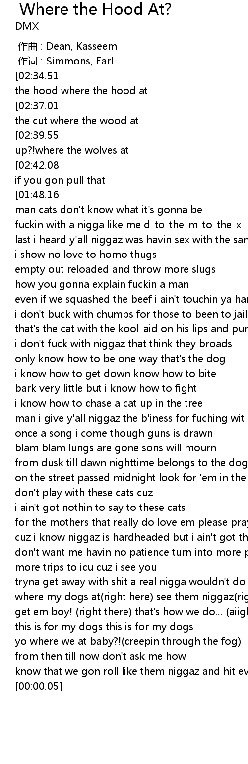 | [02:44.72][02:34.51][01:37.94][01:27.85][00:31.19][00:21.02] | where the hood where the hood where the hood at |