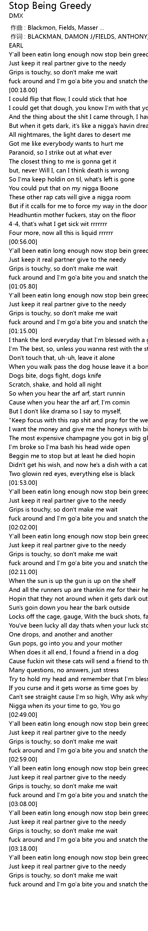| [03:18.63] | Y'all been eatin long enough now stop bein greedy |