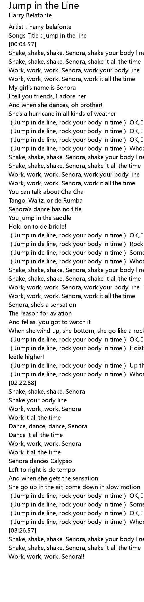 | [02:09.43] | (Jump in de line, rock your body in time) Hoist those skirts a leetle higher! |