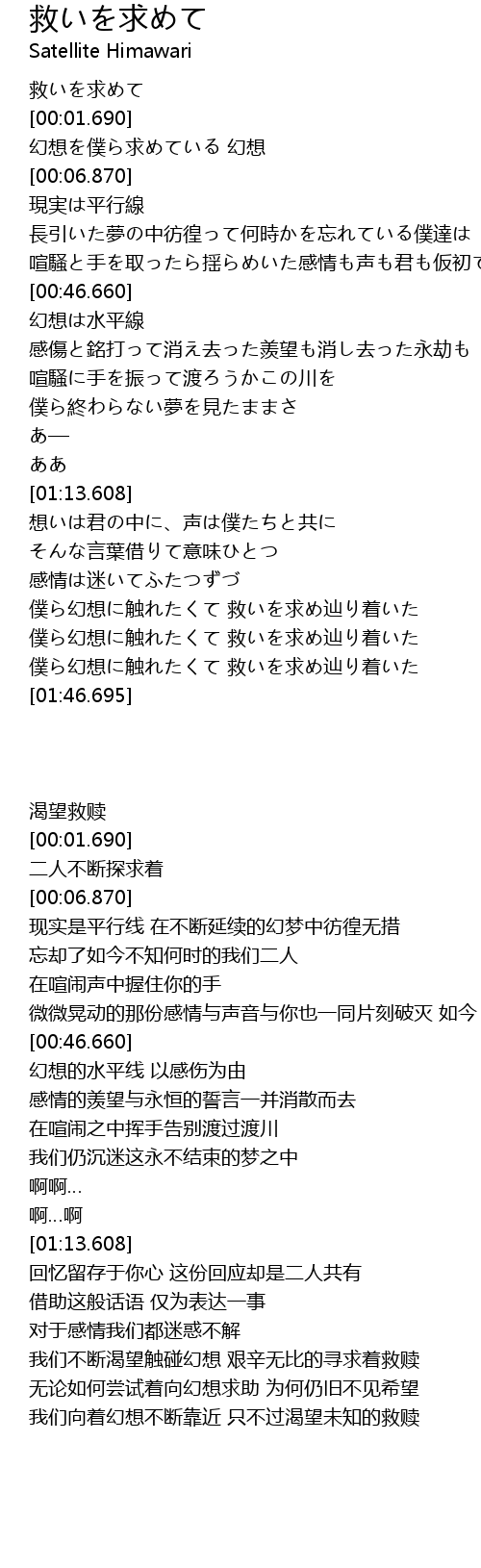 | [01:34.500] | 僕ら幻想に触れたくて 救いを求め辿り着いた |
