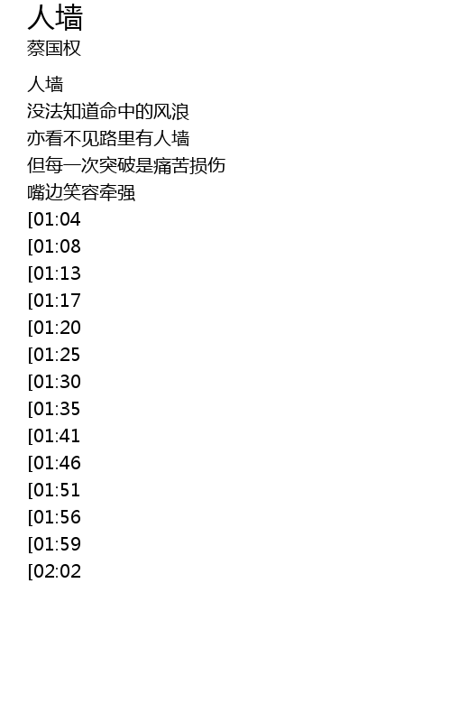 | [02:42][01:08] | 越过攀过万尺厚人墙 |