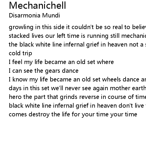 growling in this side it couldn't be so real to believe that in our small and stacked lives our left time is running still mechanichell for us is set beyond the black white line infernal grief in heaven not a switch caught aside a narrow cold trip |