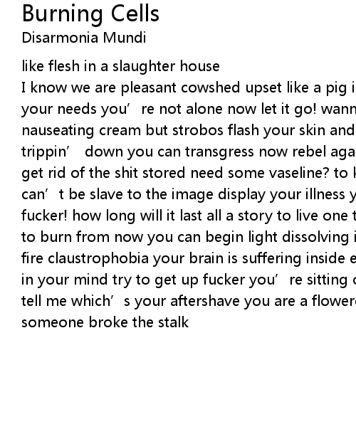 | I know we are pleasant cowshed upset like a pig in his gore swim fast and fuck your needs you' re not alone now let it go! wanna close your eyes tired of this nauseating cream but strobos flash your skin and you know you' re done, trippin' down you can transgress now rebel against what? no choice, one way to get rid of the shit stored need some vaseline? to keep good all she promises can' t be slave to the image display your illness you became slave, stupid fucker! how long will it last all a story to live one thousand of cells to hive, to burn from now you can begin light dissolving in my saliva under the tongue fire claustrophobia your brain is suffering inside exploding he found his grave in your mind try to get up fucker you' re sitting or you' re already standing tell me which' s your aftershave you are a floweret by this side to whom someone broke the stalk |