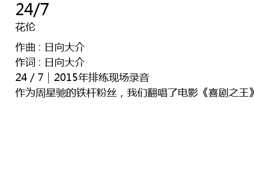 | 作为周星驰的铁杆粉丝,我们翻唱了电影《喜剧之王》里的这首《24/7》,送给每一个失意过的青年人。相信我们,在接下来伴随你的,是更多无处不在的惆怅。 |