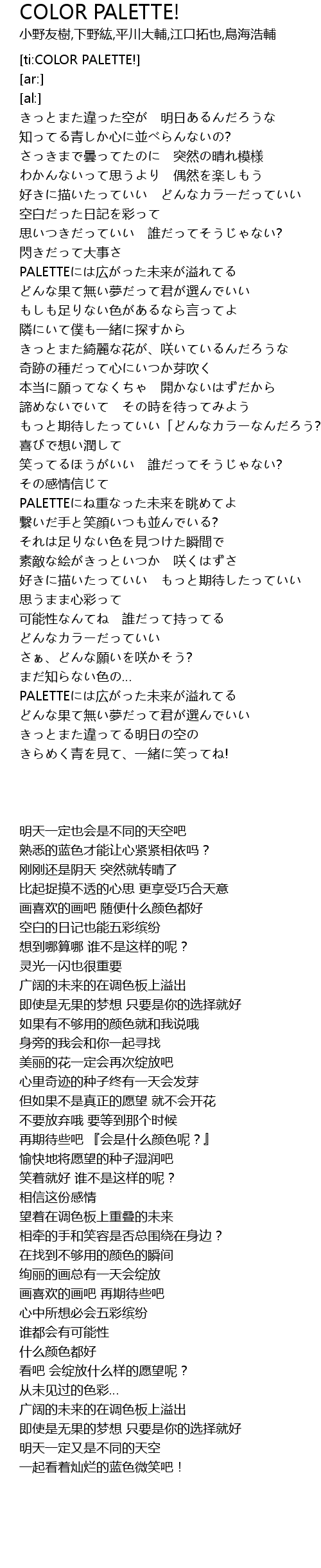 | [02:27.64] | PALETTEにね重なった未来を眺めてよ |