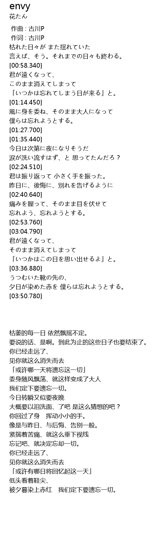 | [03:41.080] | 夕日が染めた赤を 僕らは忘れようとする。 |