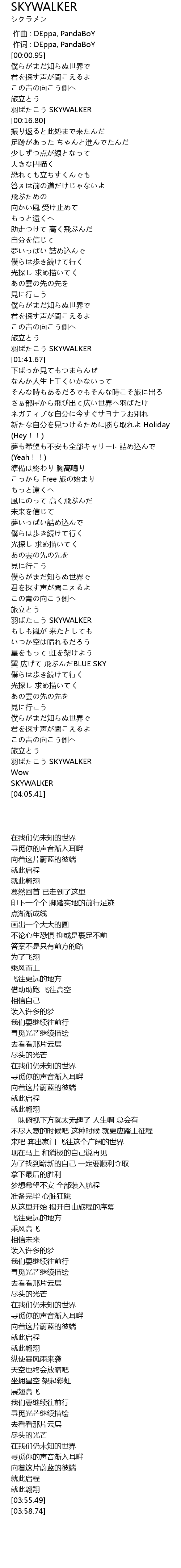 | [03:50.58] | 羽ばたこう SKYWALKER |