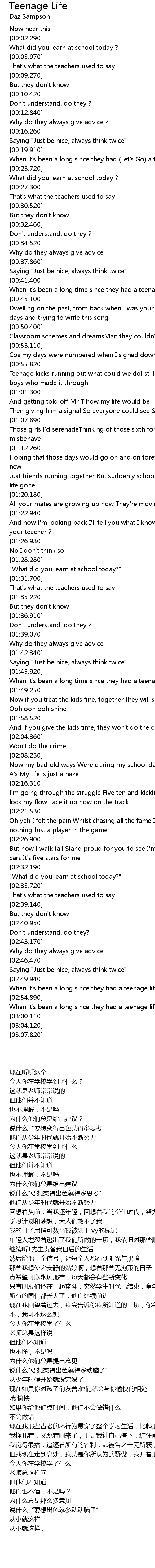 And now I'm looking back I'll tell you what I know Do you listen to your teacher ? |