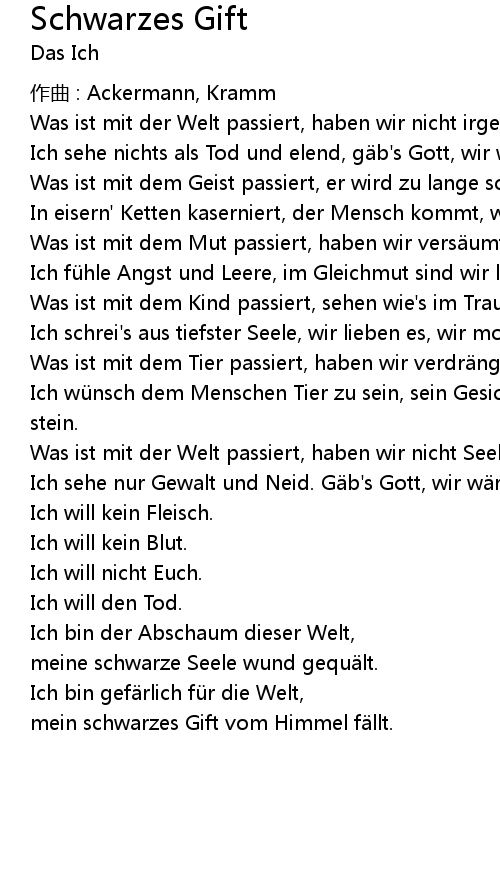 | Ich wü nsch dem Menschen Tier zu sein, sein Gesicht w r grau und kalt wie stein. | |