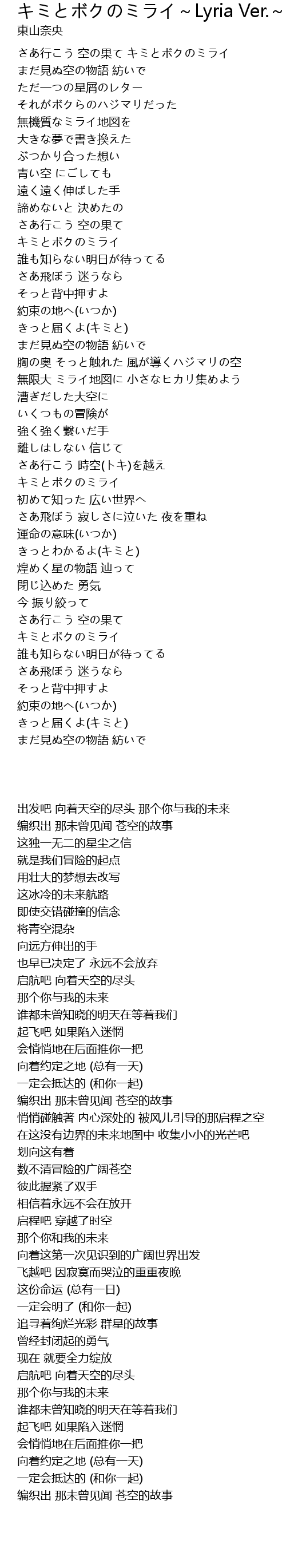| [00:00.77] | さあ行こう 空の果て キミとボクのミライ |