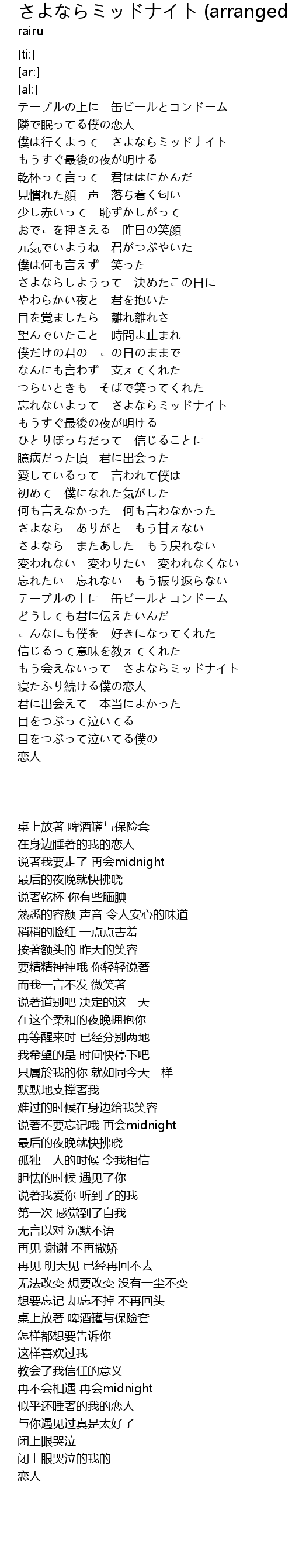 | [00:19.78] | 僕は行くよって さよならミッドナイト |