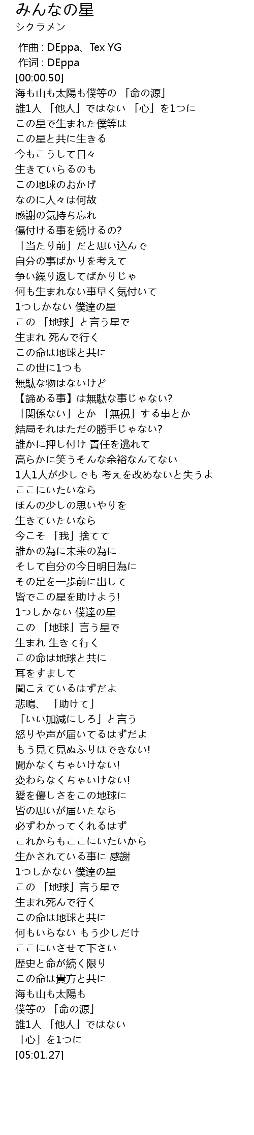 | [00:22.43] | 海も山も太陽も僕等の 「命の源」 |