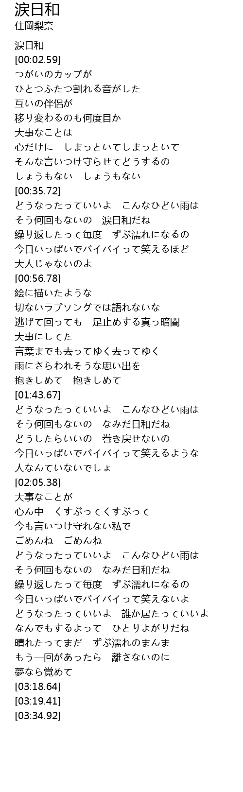 | [00:39.94] | そう何回もないの 涙日和だね |
