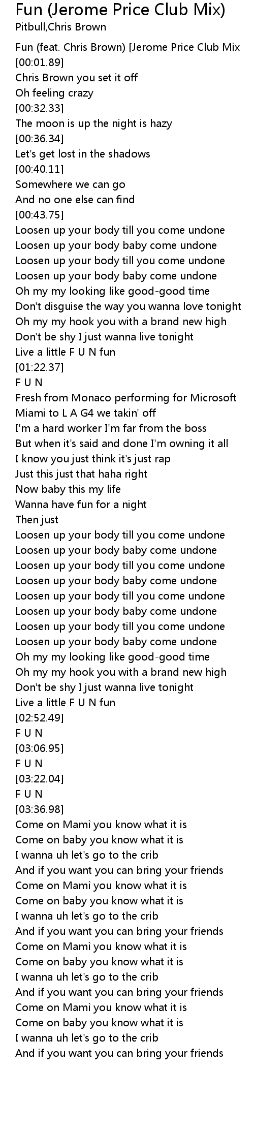 | [00:00.62]Fun (feat. Chris Brown) [Jerome Price Club Mix] | |