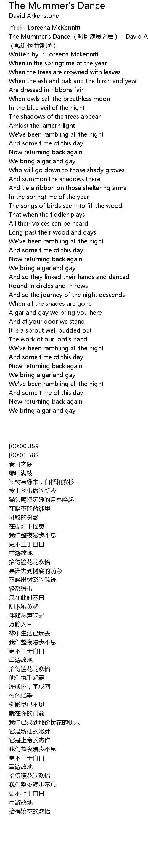 | [00:00.359] | The Mummer' s Dance yǎ jù yǎn yuán zhī wǔ David Arkenstone dài wéi ā kěn sī tōng |