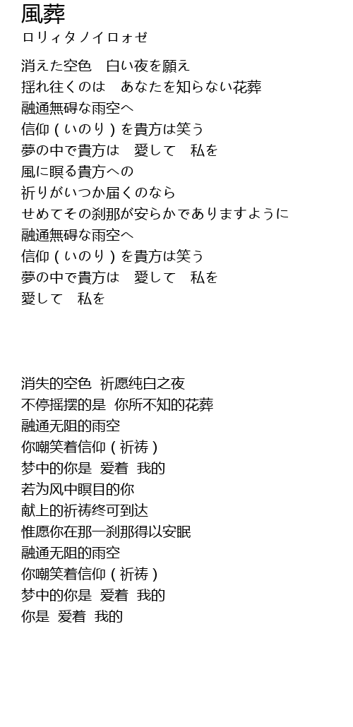 | [00:33.48] | 揺れ往くのは あなたを知らない花葬 |