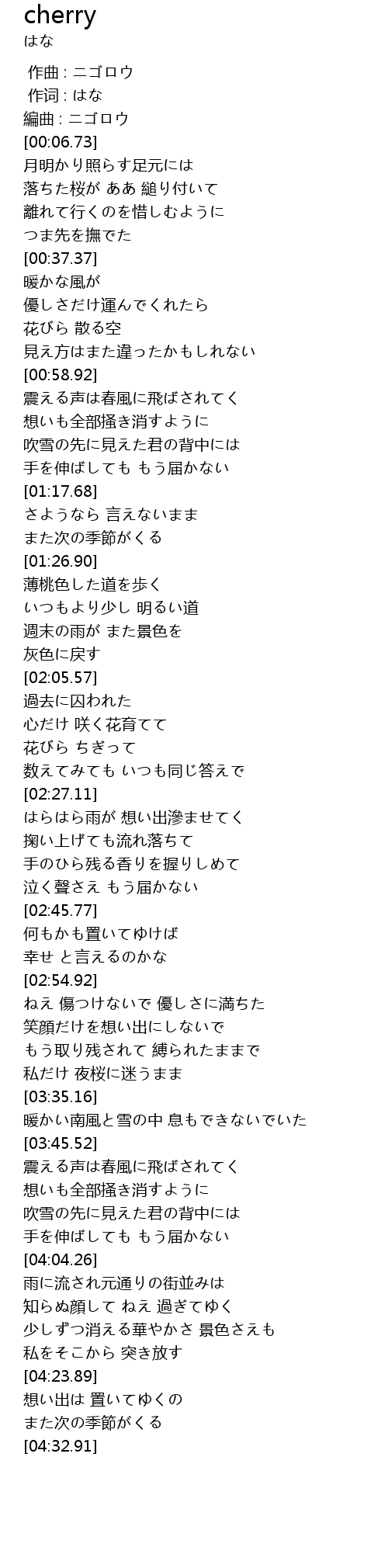 | [03:30.44] | 私だけ 夜桜に迷うまま |