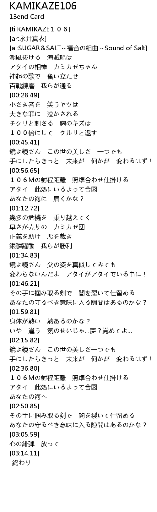 | [00:17.01] | アタイの相棒 カミカゼちゃん |