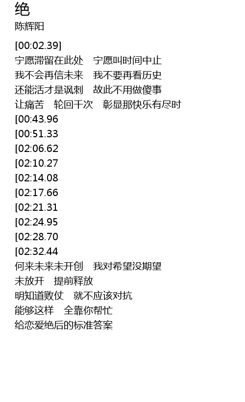 | [02:52.53][02:21.31][01:13.30] | 还不够绝望 尚可更绝望 |