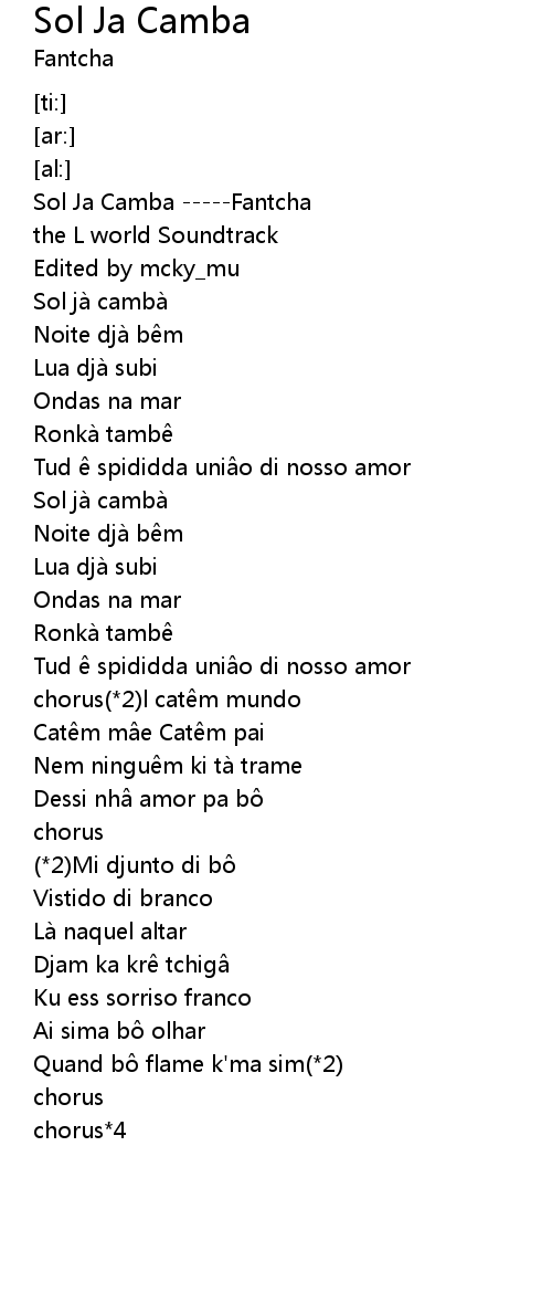 | [00:01.77] | Sol Ja Camba -----Fantcha |