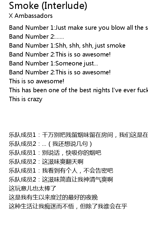 | [00:09.36] | Band Number 1:Shh, shh, shh, just smoke |