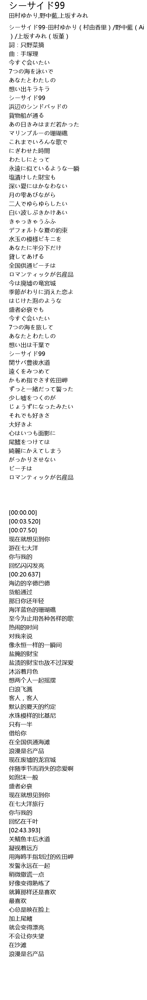 | [00:00.00] | シーサイド99-田村ゆかり(村由香里)/野中藍(Ai )/上坂すみれ(坂堇) |