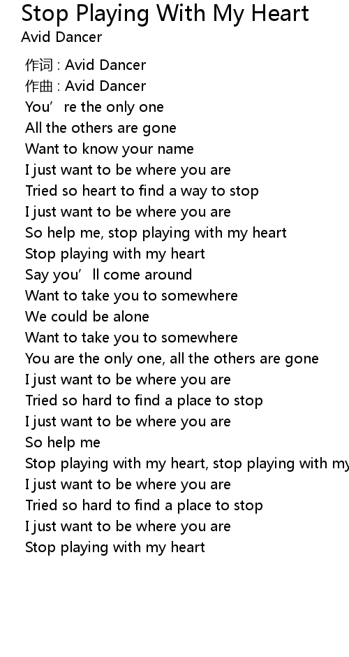 | [02:10.000] | Stop playing with my heart, stop playing with my heart |