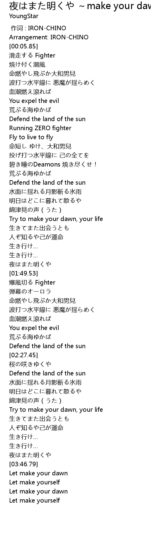 | [02:03.35] | 命燃やし飛ぶか大和男兒 |