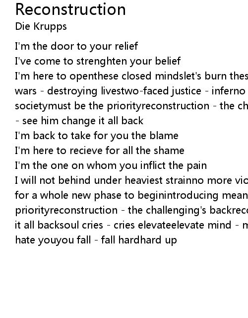 I'm here to openthese closed mindslet's burn these bridges that us blindno more wars - destroying livestwo-faced justice - inferno of liesintroducing meaning to societymust be the priorityreconstruction - the challenging's backreconstruction - see him change it all back |